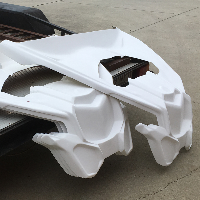 The panels are hand-laid chopped strand mat to ensure a consistent fit and finish. The panel set consists of three panels, a bonnet and 2 side panels.